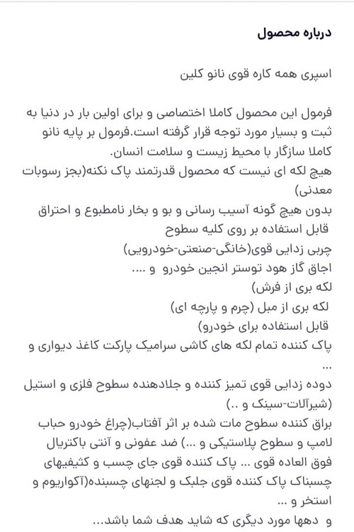 فرمول این محصول کاملا اختصاصی و برای اولین بار در دنیا به ثبت و بسیار مورد توجه قرار گرفته است. فرمول بر پایه نانو کاملا سازگار با محیط زیست و سلامت انسان هیچ لکه ای نیست که محصول قدرتمند پاک نکنه بجز رسوبات