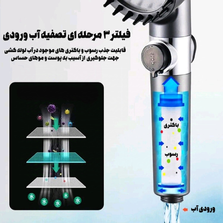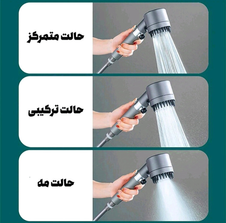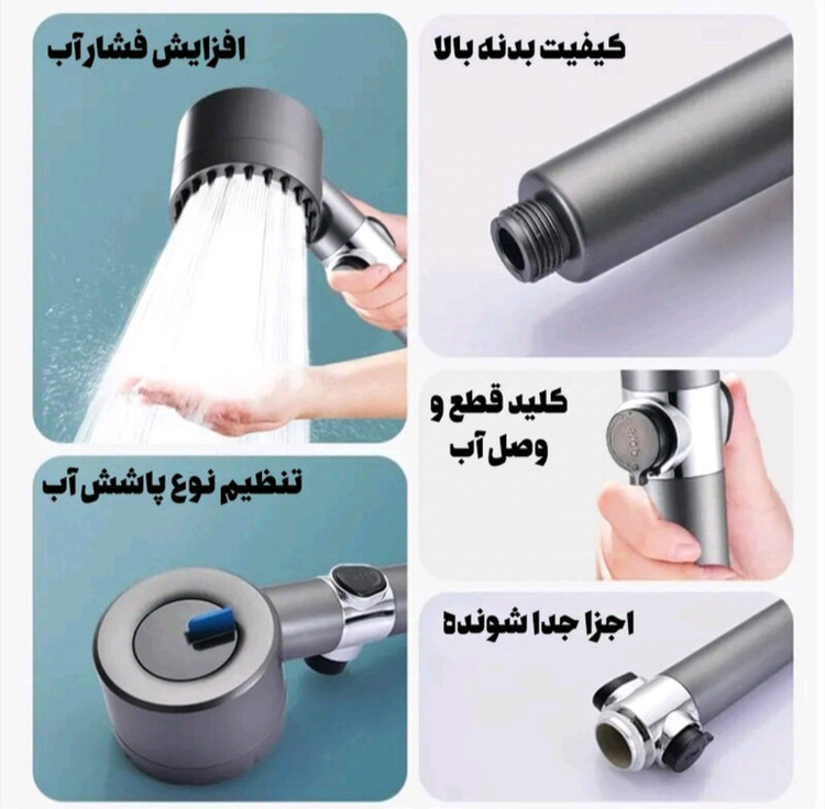 دارای ۴حالت پاشش آب: افزایش فشار،مخلوط،مه پاش،ماساژور سیلیکونی.